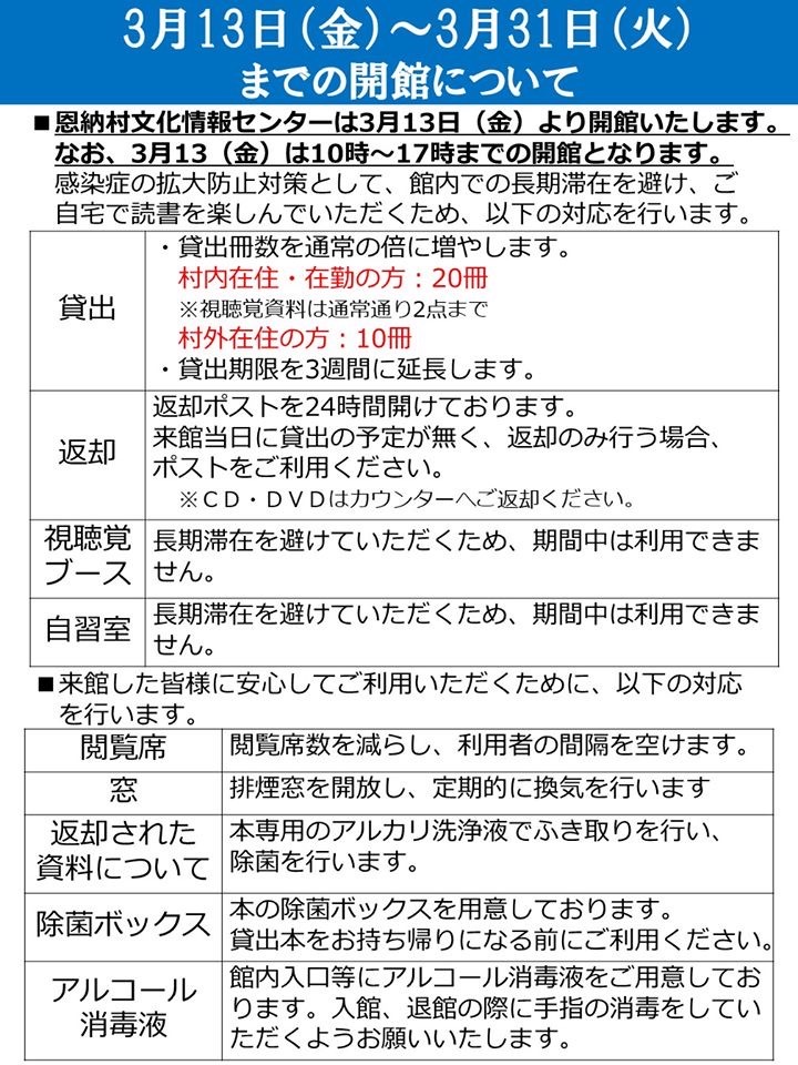 【お知らせ】恩納村文化情報センター開館について ニュース March 16, 2020 wordpress 3月13日(金)~3月31日(火)までの開館について ■恩納村文化情報センターは3月13日(金)より開館いたします。なお、3月13日(金)は10時~17時までの開館となります。 感染症の拡大防止として、館内での長期滞在を避け、ご自宅で読書を楽しんでいただくため以下の対応を行います。 詳細はこちら:https://www.onnanavi.com/2020/03/16/%E3%80%90%E3%81%8A%E7%9F%A5%E3%82%89%E3%81%9B%E3%80%91%E6%81%A9%E7%B4%8D%E6%9D%91%E6%96%87%E5%8C%96%E6%83%85%E5%A0%B1%E3%82%BB%E3%83%B3%E3%82%BF%E3%83%BC%E9%96%8B%E9%A4%A8%E3%81%AB%E3%81%A4%E3%81%84/ Sharing Twitter Email this article Print this article Tags 恩納村観光協会