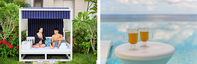 温水仕様にアップグレードされた「オーシャンテラスプール」では、日中は透き通るようなコーラルブルーの海を、夕刻には壮麗なサンセットを望みながら、冬の季節でも心地よく温められた水面に身をゆだね、沖縄の美しさを存分にご堪能いただけます。プールサイドには、プライベートな空間を確保できるカバナ(1グループ最大3名)を配し、電気ヒーターも完備。ウェルカムドリンクとして、ミネラルやビタミン、ポリフェノールが豊富な沖縄県産の黒糖を使用したハレクラニ沖縄ドリンクをお一人につき一杯を提供します。冬の沖縄ならではの贅沢なひとときを、「ハレクラニ沖縄」でぜひお楽しみください。