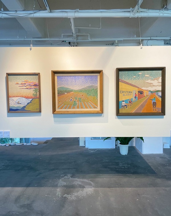 沖縄の海の砂で描かれた砂絵には、ラテンアメリカの旅で経験した人生観、音楽、街の彩り等が反映されています。